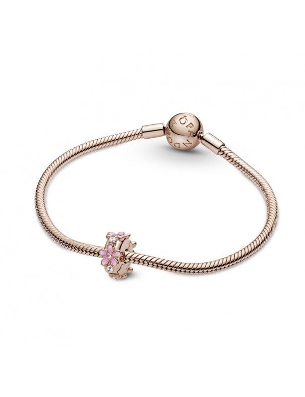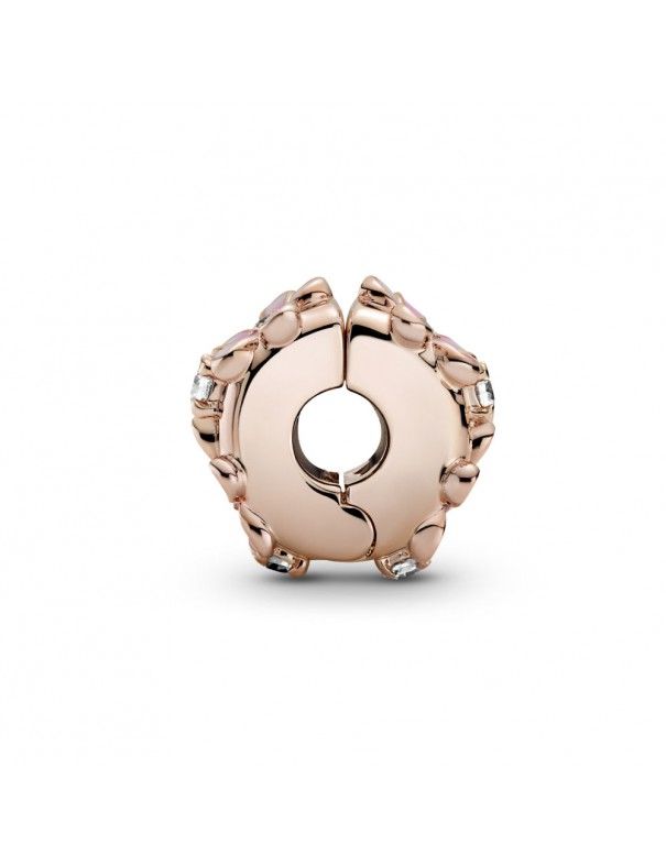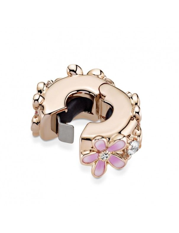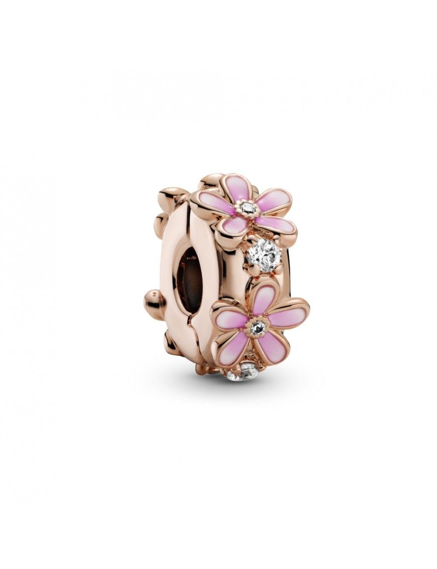 Clip Pandora Rose Margarita Rosa 788809C01, una aleación de metales con recubrimiento en oro de segunda ley de 14k. Adornado con circonitas, esmalte rosa y blanco.