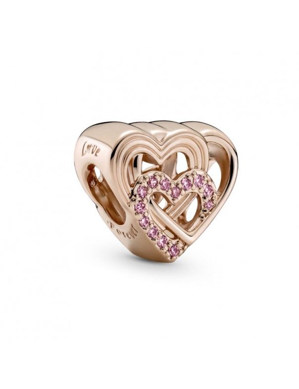 Charm Pandora Corazones De Amor Entrelazados 789529C01, en plata de primera ley 925mls decorado con una aleación única de metales con un recubrimiento electrolítico en oro rosa de segunda ley de 14kts, adornado con circonitas cúbicas transparentes y grabado "Love Forever" y "& Always".