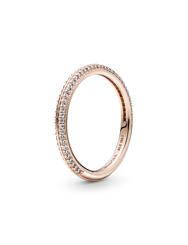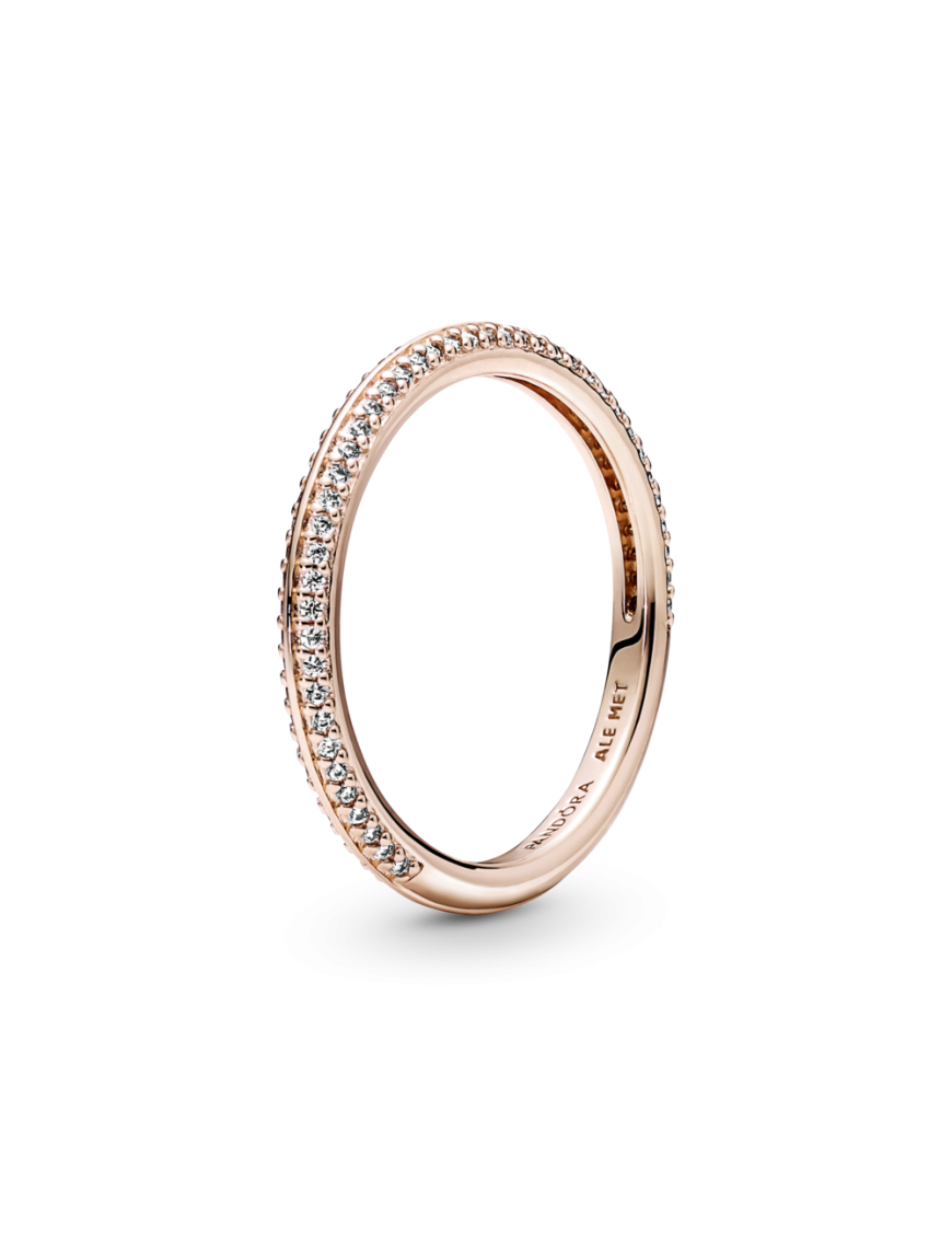 Anillo Pavé Brillante Pandora Me 189679C01-56, de metal con recubrimiento electrolítico de oro rosa de 14kts, decorado con 72 circonitas talla brillante. Posibilidad de unir con otro anillo mediante conector y decorarlo con colgantes Pandora Me. Equivale a una talla 16.