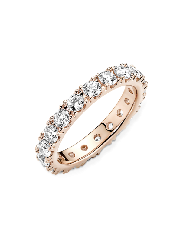 Anillo Pandora Eternity Brillante 180050C01-52, aleación única de metales con recubrimiento electrolítico en oro de segunda ley de 14kts. Decorado con circonitas. Equivale a una talla 12.