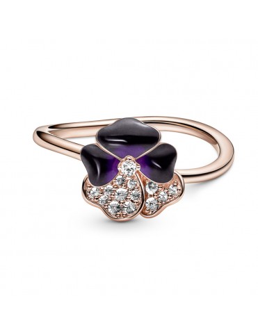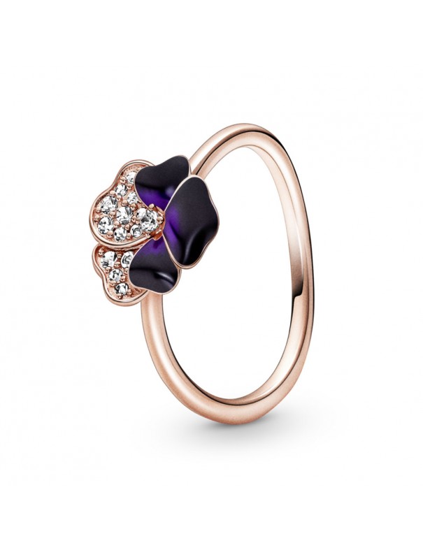 Anillo Pandora Flor Pensamiento Morado 180764C01-52, con recubrimiento electrolítico de oro rosa de segunda ley de 14kts, decorado con esmalte y circonitas. Equivale a una talla 12.