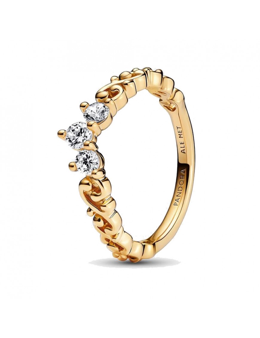 Anillo Pandora Tiara Real Remolino 162232C01, en metal con recubrimiento electrolítico de oro de segunda ley de 14kts. Decorado con circonitas. Equivale a una talla 14.