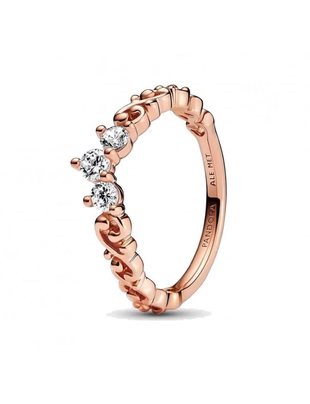 Anillo Pandora Tiara Real Remolino 182232C01-54, en metal con recubrimiento electrolítico de oro rosa de segunda ley de 14kts. Decorado con circonitas. Equivale a una talla 14.