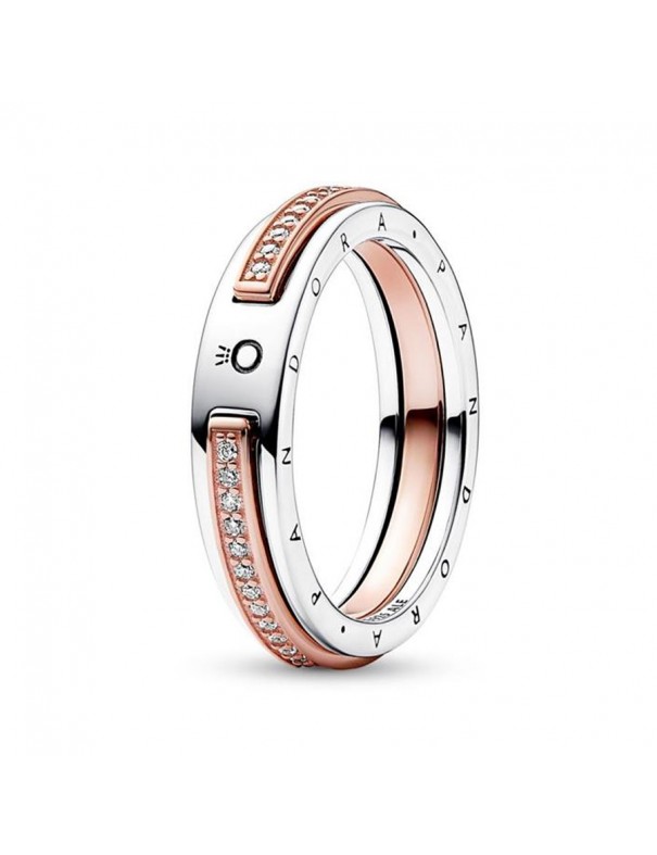 Anillo Logo y Pavé en Dos Tonos Pandora Signature 182773C01-50 para mujer. Está realizado en plata de primera ley de 925 mls, una aleación especial de metales con baño de oro rosa de 14 kts y circonitas. Es de la talla 10 (ver tallas).