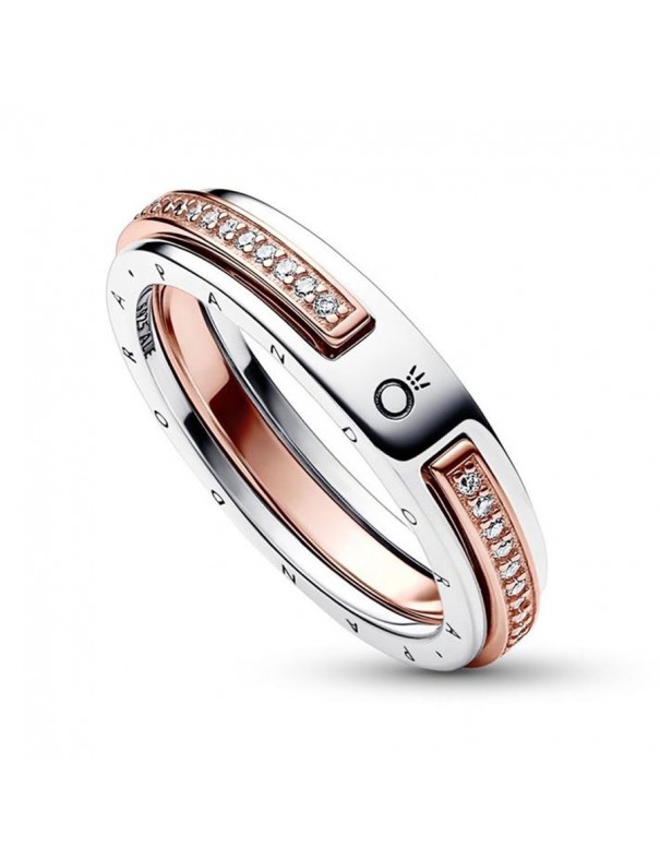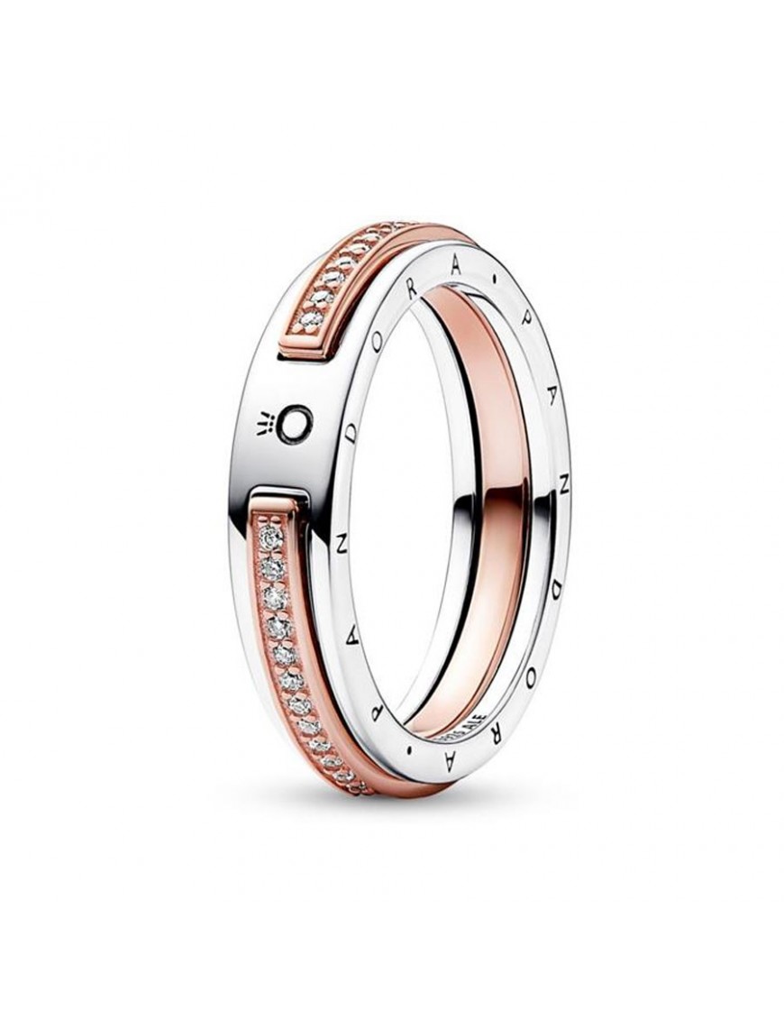 Anillo Logo y Pavé en Dos Tonos Pandora Signature 182773C01-58 para mujer. Está realizado en plata de primera ley de 925 mls, una aleación especial de metales con baño de oro rosa de 14 kts y circonitas. Es de la talla 18 (ver tallas).