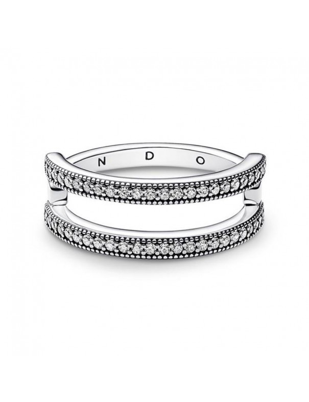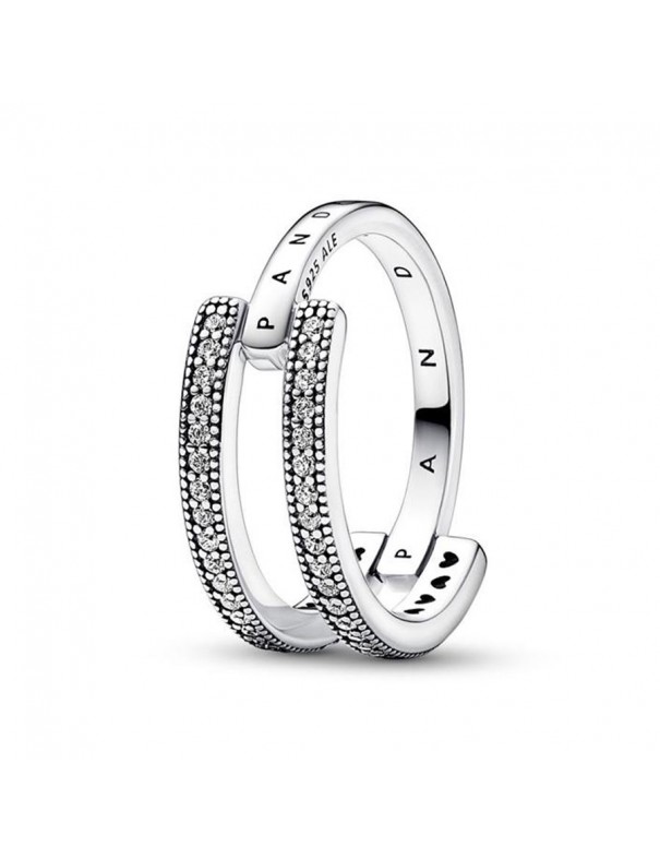Anillo Doble Banda Logo y Pavé Pandora Signature 192779C01-52 para mujer. Está fabricado en plata de primera ley de 925 mls y circonitas. Es de la talla 12 (ver tallas).