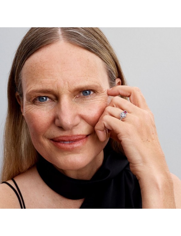Anillo Pandora Halo Corazones 193662C01-54. Fabricado en plata de primera ley con gemas brillantes a los lados y una circonita transparente junto a un cristal artificial en color rojo. Garantía de 3 años.