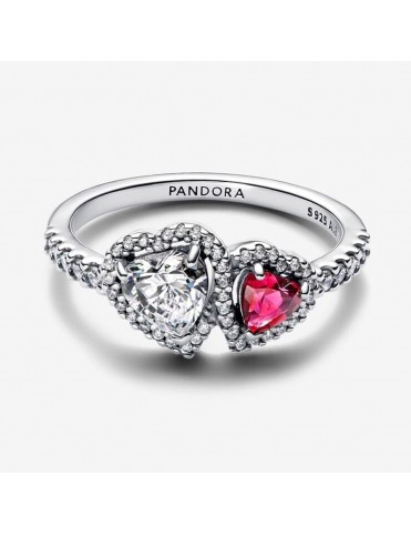 Anillo Pandora Halo Corazones 193662C01-52. Fabricado en plata de primera ley con gemas brillantes a los lados y una circonita transparente junto a un cristal artificial en color rojo. Garantía de 3 años.