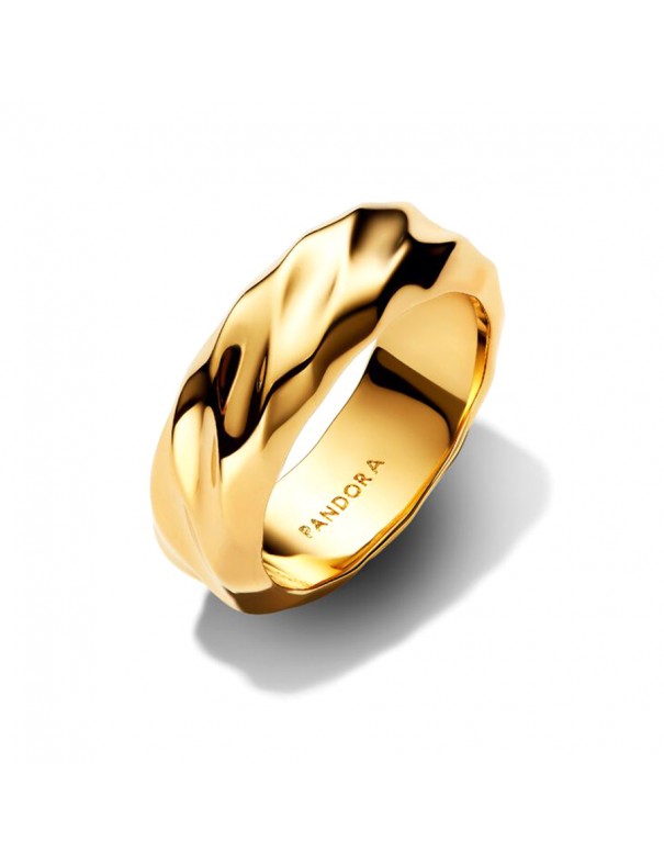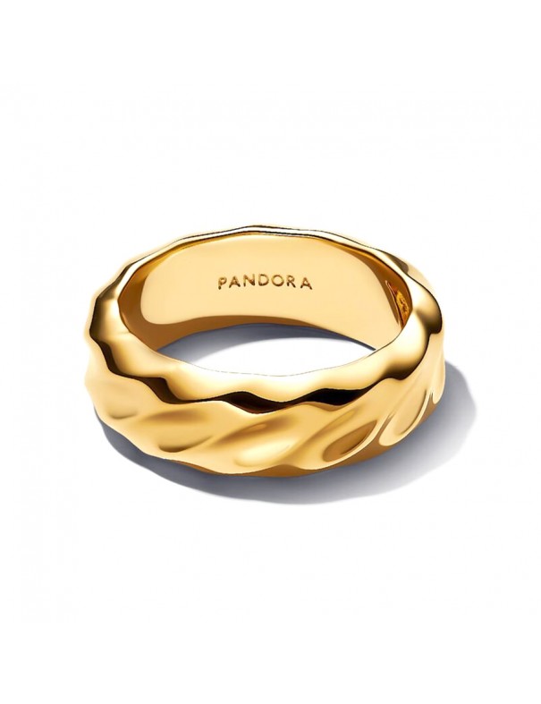 Anillo Banda Ancha Ondulada 163886C00-52. El anillo está fabricado con una aleación única de metales y recubierto en oro de 14k, lo que le da un brillo cálido y duradero. Cuenta con un diseño ondulado y un acabado a mano. Es una talla 52.