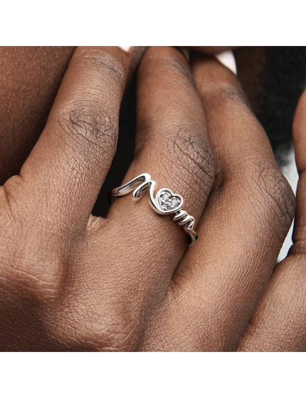Anillo Pandora Corazón de Madre en Pavé 191149C01-54. Anillo elaborado en plata de primera ley y decorado con circonitas cúbicas transparentes que aportan brillo y elegancia. Su diseño forma la palabra “Mom” en el centro, creando un detalle lleno de cariño y significado, perfecto para celebrar el amor de una madre. Es una talla 54.