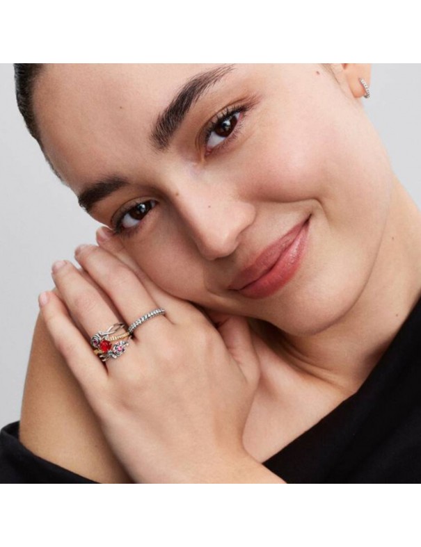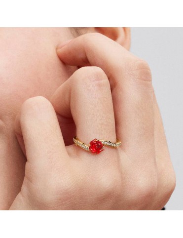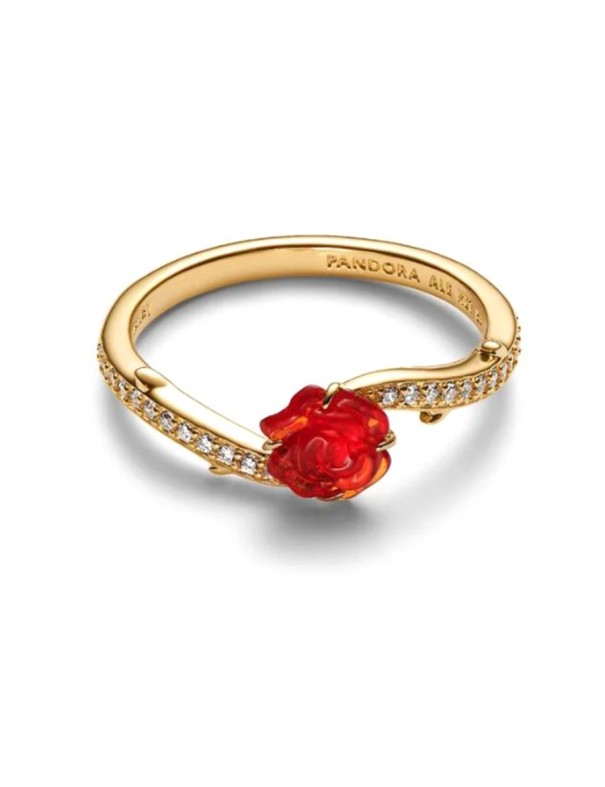 Anillo Pandora Rosa Encantada de la Bella y la Bestia de Disney 163984C01-52. Fabricado con aleación metálica bañada en oro de 14 k. Este anillo dorado presenta una delicada rosa roja de vidrio murano rodeada de circonitas cúbicas y detalles de espinas a lo largo de la banda, evocando el cuento de La Bella y la Bestia. Es una talla 52.