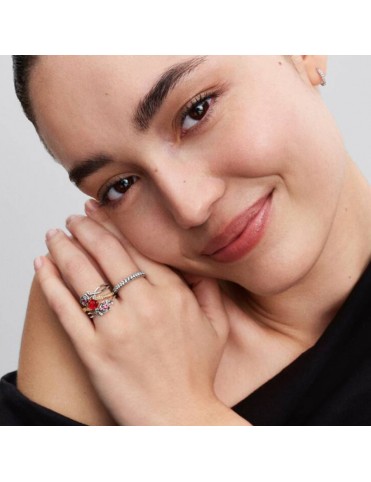 Anillo Pandora Rosa Encantada de la Bella y la Bestia de Disney 163984C01-54. Fabricado con aleación metálica bañada en oro de 14 k. Este anillo dorado presenta una delicada rosa roja de vidrio murano rodeada de circonitas cúbicas y detalles de espinas a lo largo de la banda, evocando el cuento de La Bella y la Bestia. Es una talla 54.