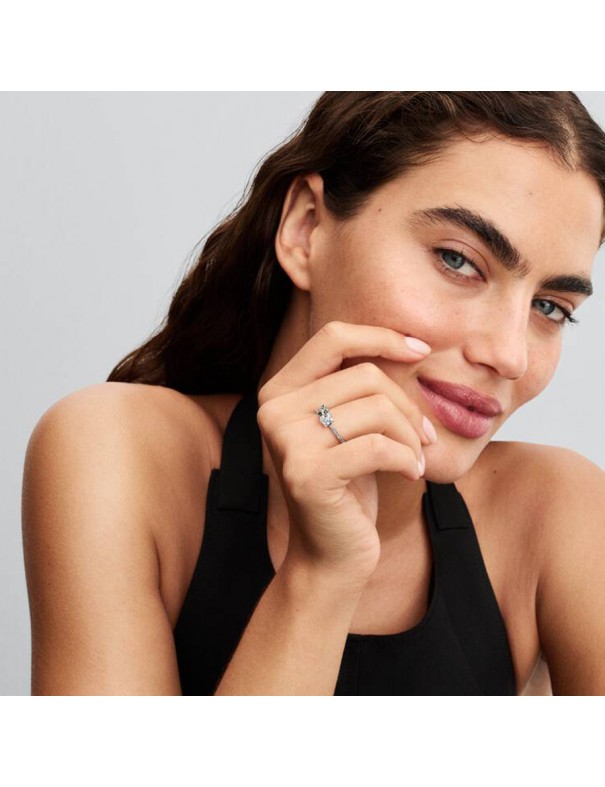 Anillo Pandora Gema y Stitch de Disney 193740C01-52. Hecho en plata de ley con acabado pulido, este anillo presenta detalles en esmalte negro que dibujan la silueta de Stitch. La pieza central es una circonita cúbica de gran tamaño en forma rectangular, mientras que media banda del aro está engarzada con pequeñas circonitas que aportan destello adicional. Es una talla 52.