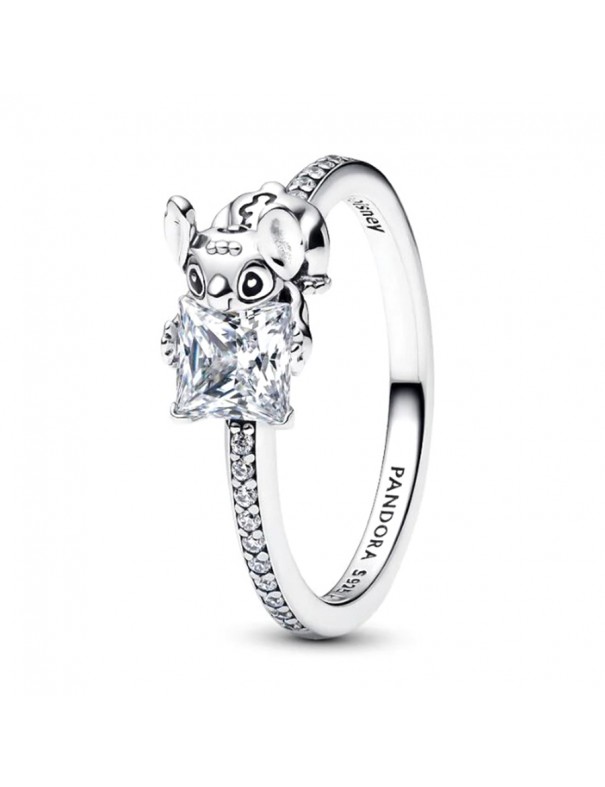 Anillo Pandora Gema y Stitch de Disney 193740C01-54. Hecho en plata de ley con acabado pulido, este anillo presenta detalles en esmalte negro que dibujan la silueta de Stitch. La pieza central es una circonita cúbica de gran tamaño en forma rectangular, mientras que media banda del aro está engarzada con pequeñas circonitas que aportan destello adicional. Es una talla 54.