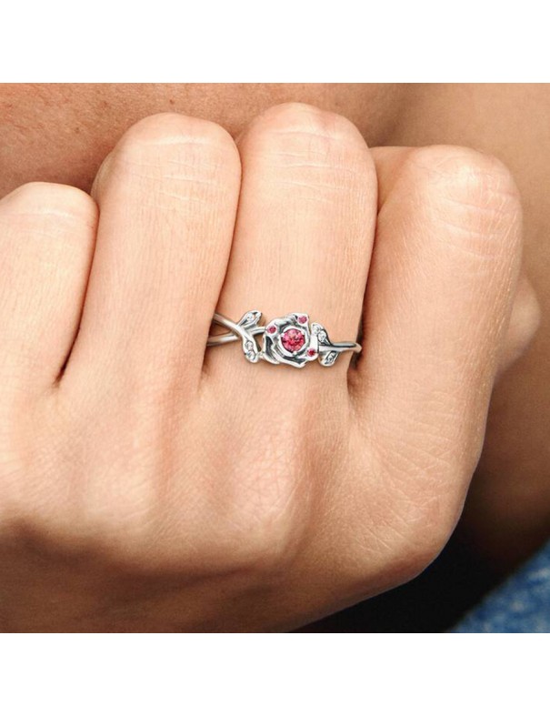 Anillo Pandora Rosa de la Bella y la Bestia de Disney 190017C01-50. Fabricado en plata de ley 925, este anillo en color plateado presenta en su centro una rosa hecha con circonitas cúbicas rojas, rodeada de hojas y ramas abiertas que evocan el diseño encantado de la película; ideal para quienes buscan una joya que combine fantasía y elegancia.