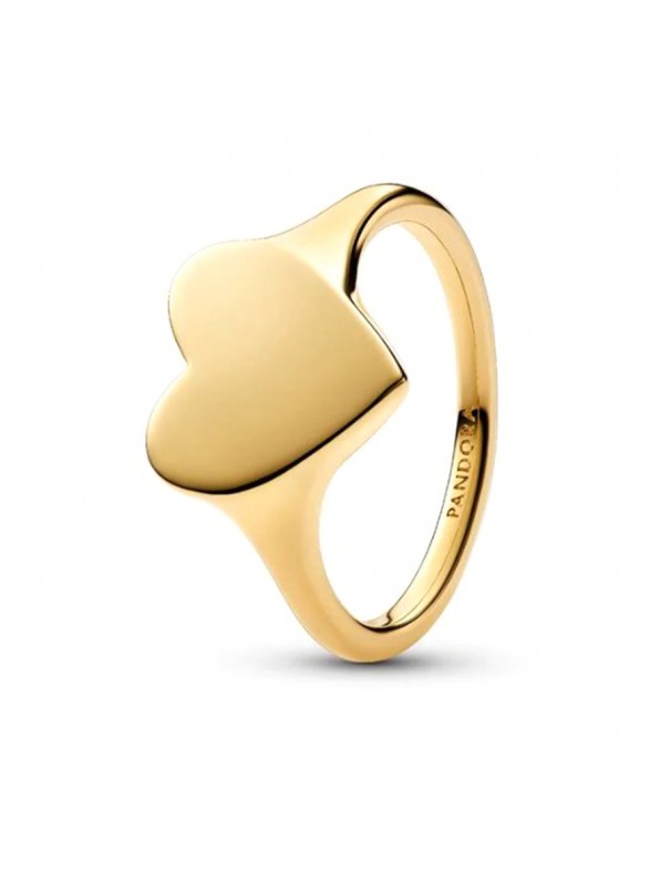 Anillo Pandora Corazón Grabable 163988C00-52. Creado en aleación de metales con un recubrimiento de oro de 14 k, de color dorado cálido, diseñado en forma de corazón amplio y con superficie lisa que permite personalización mediante grabado. Es una talla 52.