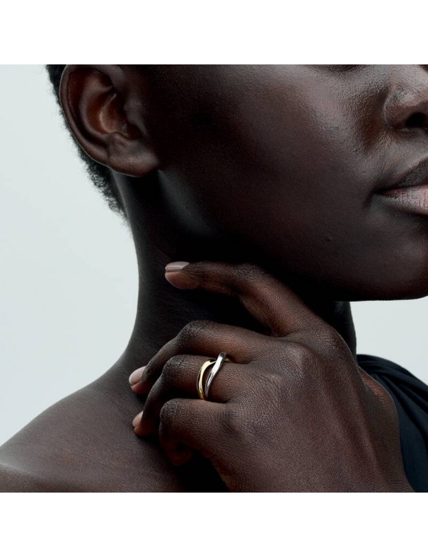 Anillo Pandora Bandas Entrelazadas en Dos Tonos 163262C00-60. Anillo compuesto por dos bandas entrelazadas: una en plata de ley y otra con baño de oro de 14 k, generando un contraste bicolor elegante. Su diseño es ligeramente ondulado y redondeado, lo que le da un aire escultural y moderno.