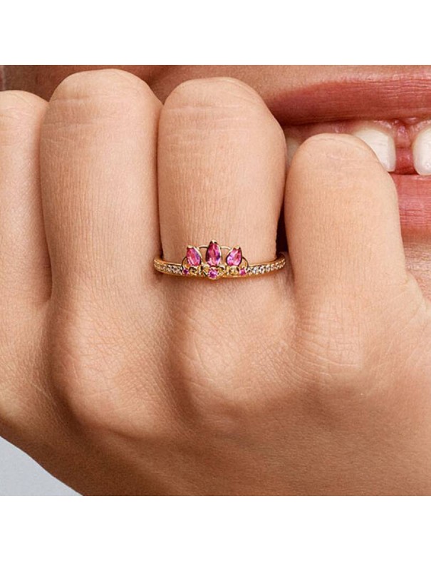 Anillo Princesa Rapunzel de Disney 163651C01-48. Anillo con forma de tiara, realizado en plata de ley con chapado en oro de 14 k. Luce tres gemas en forma de pera color púrpura claro y un pavé de circonitas transparentes, con detalles de filigrana en espiral que realzan su diseño delicado y femenino.
