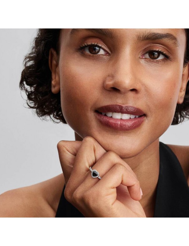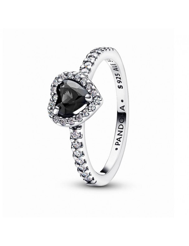 Anillo Pandora Corazón Negro Elevado 198421C04-52. Fabricado en plata de primera ley con acabado pulido y diseño elegante en forma de corazón. Tiene una piedra central negra en forma de corazón (cristal sintético) rodeada por un halo de circonitas cúbicas brillantes, que se elevan sobre la banda.