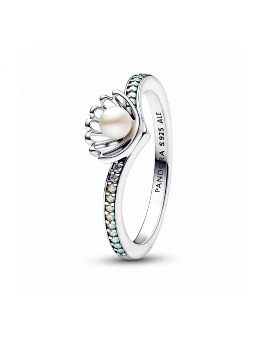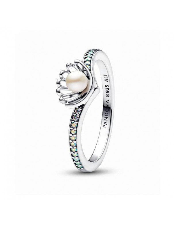 Anillo Pandora Perla Cultivada de Agua Dulce Tratada Concha Princesa Ariel de Disney 193654C01-56. Anillo femenino de plata de primera ley con diseño inspirado en Ariel de Disney. Su montaje imita una concha marina calada con una perla cultivada de agua dulce blanca en su interior. La banda está parcialmente engastada con piedras de circonita que brillan como destellos sobre las olas.