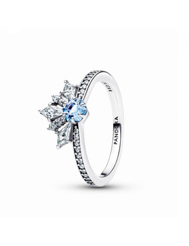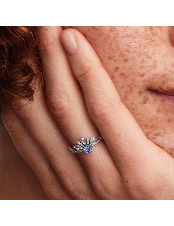 Anillo Pandora Tiara Reina Elsa de Frozen de Disney 194134C01-50. Realizado en plata esterlina, de color plateado, con diseño en forma de tiara inspirado en Elsa (Frozen). Está decorado con una piedra central de cristal azul‑agua y varias circonitas cúbicas transparentes que aportan brillo.