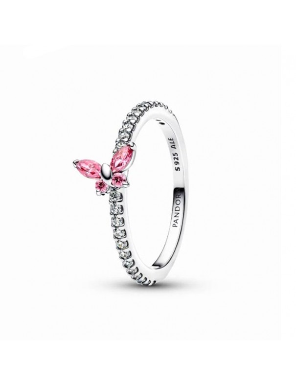 Anillo Pandora Mariposa Rosa Brillante 194269C02-52. Creado en plata de primera ley, color plata, con una mariposa engastada que luce circonitas cúbicas rosa en las alas y circonitas transparentes a lo largo de la banda. Diseño brillante, delicado y simbólico que representa transformación y belleza.