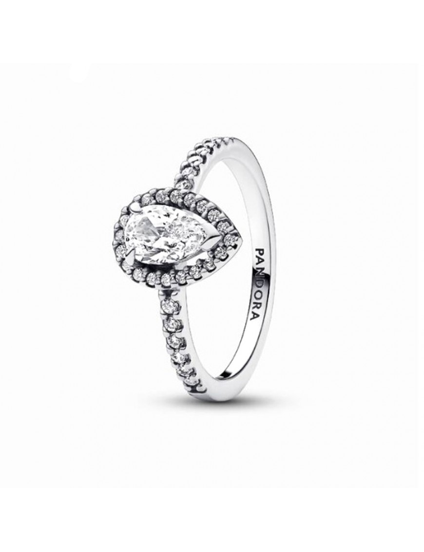 Anillo Pandora Halo Brillante Corte Pera 192835C01-48. Fabricado en plata de ley de color plateado, con una piedra central transparente en talla pera ligeramente elevada, rodeada por un halo de circonitas cúbicas transparentes y con parte del aro también engastado.