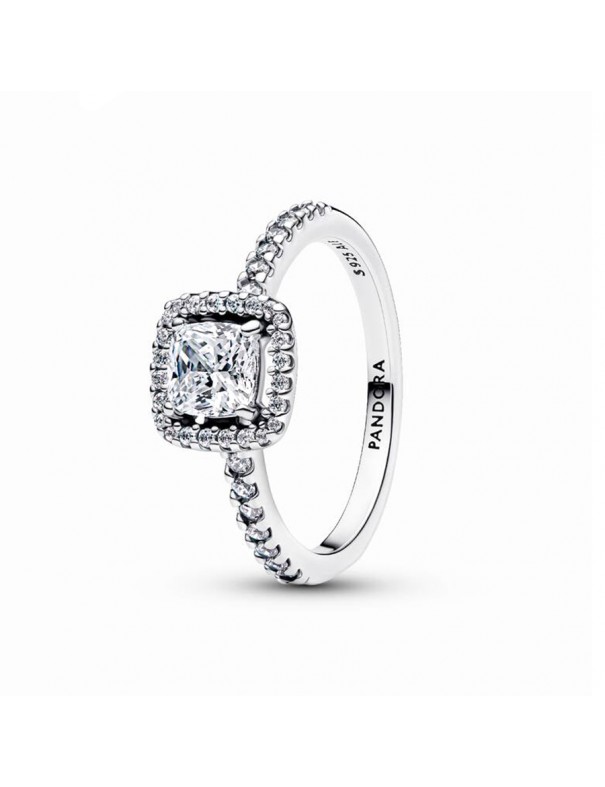 Anillo Pandora Halo Cuadrado Brillante 193555C02-56. Anillo de plata de primera ley, color plateado, con una circonita cúbica de talla cuadrada en el centro. Está rodeada por un halo de pequeñas circonitas (pavé) que potencian su brillo y elegancia.