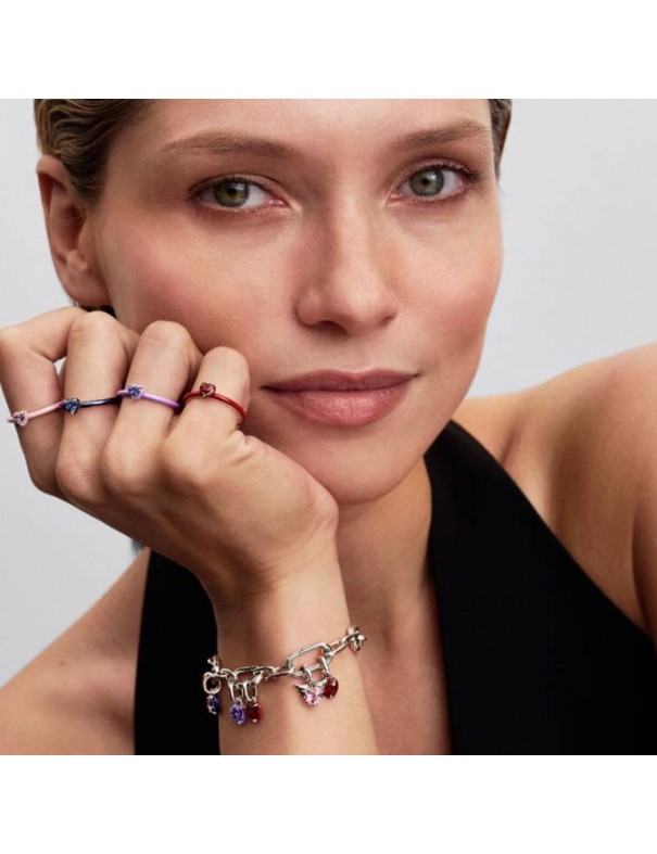 Anillo Pandora Corazón Chakra Rojo 193088C05-52. Creado en plata de primera ley con una gema central de cristal rojo en forma de corazón y detalles en esmalte rojo alrededor, que simboliza amor y vitalidad. Tiene forma clásica de banda con el corazón como foco principal, aportando un toque de color.