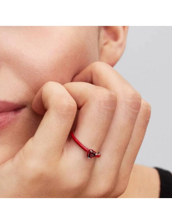 Anillo Pandora Corazón Chakra Rojo 193088C05-56. Creado en plata de primera ley con una gema central de cristal rojo en forma de corazón y detalles en esmalte rojo alrededor, que simboliza amor y vitalidad. Tiene forma clásica de banda con el corazón como foco principal, aportando un toque de color.