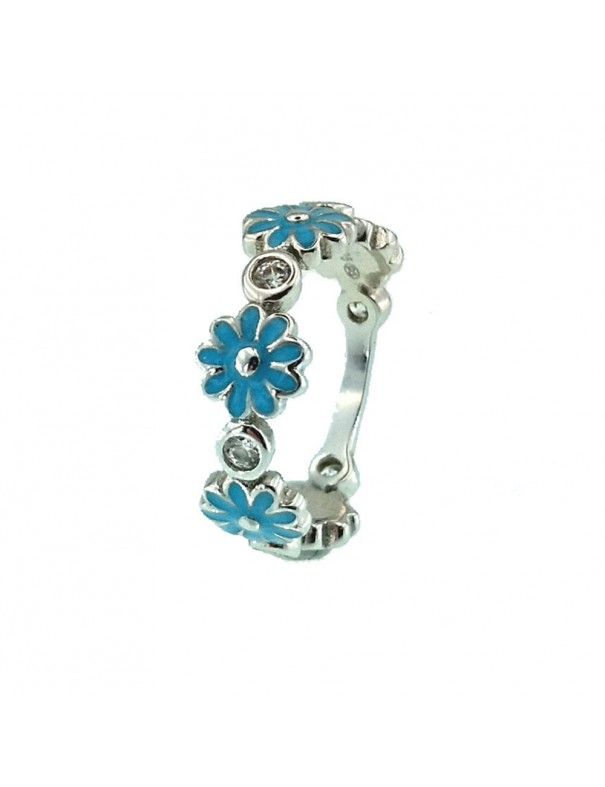 Anillo Plata Niña Flor Esmalte Azul RC294, fabricado en plata de primera ley 925mls y baño de rodio. Flores con esmalte azul y circonitas.