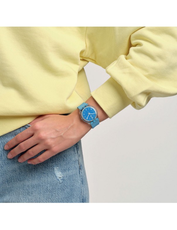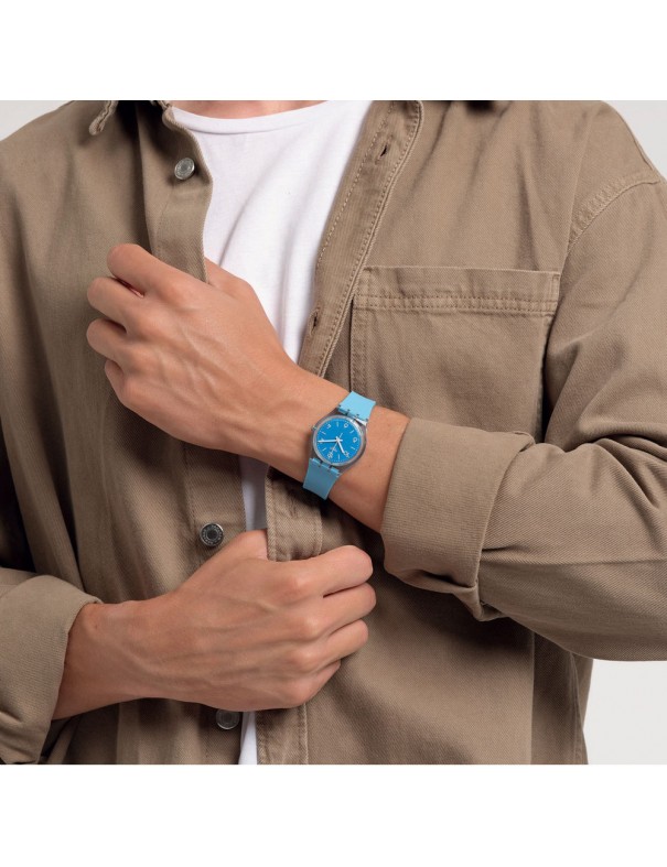 Reloj Swatch Turquoise Tonic SO28S101 (M), analógico de tres agujas. Caja y correa de material con origen biolóico. Diámetro de 34mm. Sumergible a 3ATM, por lo que sólo soporta pequeñas salpicaduras.