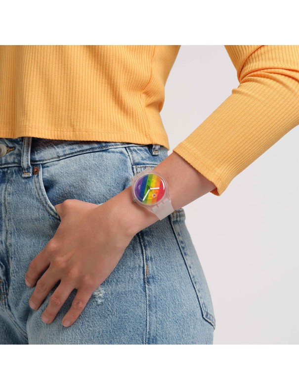 Reloj Swatch Stripe Fierce (L) SO29K701, analógico de tres agujas. Caja de material con origen biológico de 41mm de diámetro. Pulsera de silicona. Sumergible a 3ATM, por lo que sólo soporta pequeñas salpicaduras.