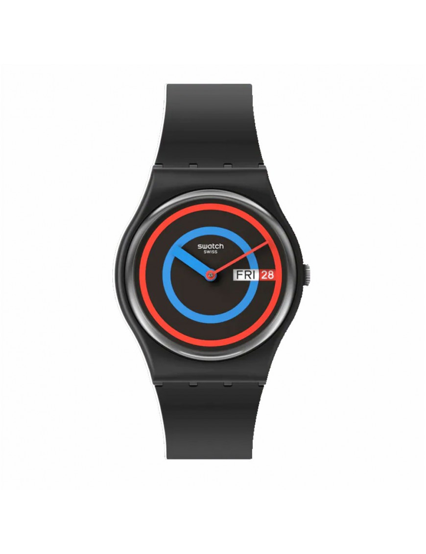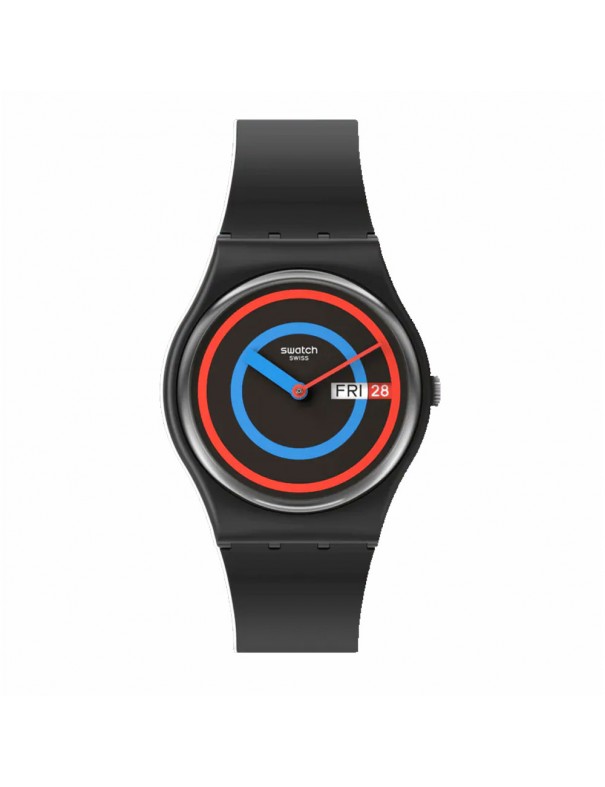 Reloj Swatch Circling Black SO28B706 (M), analógico de tres agujas y ventana de calendario. Caja de 34mm de diámetro. Pulsera de silicona. Sumergible a 3ATM, por lo que sólo es apto para pequeñas salpicaduras.