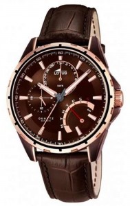 – Reloj Lotus Hombre 18211/1. Multifunción. Caja de acero inoxidable recubierto de PVD marrón. Correa de cuero marrón con hebilla. Agujas luminosas. Diámetro de 44 mm. Sumergible a 5 ATM. Garantía de 2 años. Tiene un precio de 159 euros, al que se le aplica un descuento del 10% y se queda en 143,10 euros, a este precio debemos restarle un 2% adicional si pagas con tarjeta.