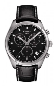 Reloj Tissot PR 100 T1014171605100 GENT: reloj analógico cronógrafo. La caja donde se encuentra el mecanismo es de acero y la correa es de cuero. El cristal que protege el reloj es de zafiro.