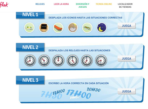 Dentro de la página web de Flik & Flak podemos encontrar un juego para que los niños aprendan las horas llamado “Juega y aprende con Flik & Flak”.