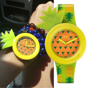 Uno de los diseños más espectaculares está diseñado por la firma Swatch, el modelo Exotic Taste GG218, de la Colección Surfing The Wave. Este reloj es muy original porque tiene una carcasa en forma de piña que se puede quitar o poner.