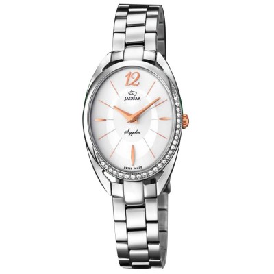 Este reloj para mujer de la firma Jaguar se encuentra dentro de la colección Cosmopolitan. Su diseño es clásico pero innovador porque la caja que contiene el mecanismo tiene una forma ovalada. Esta característica tan peculiar otorga más notoriedad y distinción al diseño.