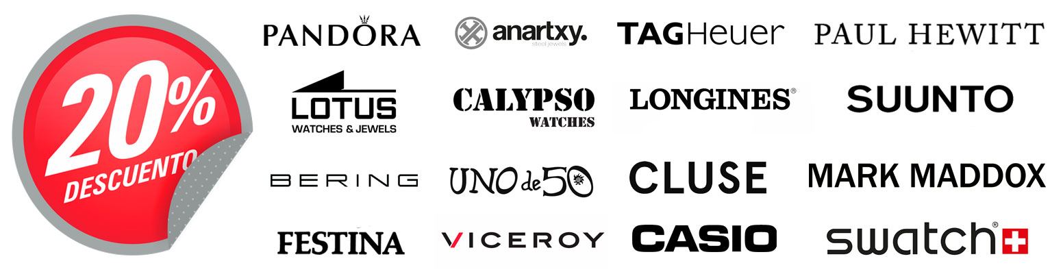 Tenemos un catálogo muy completo de relojería y joyería. Entre nuestras marcas encontraras: Viceroy, Lotus, Pandora, TAG Heuer, Calypso, Mark Maddox, Uno de 50, Marea, Casio, Festina, Agatha Ruiz de la Prada, Cluse, Paul Hewitt, Longines, Suunto, Bering, Swatch…