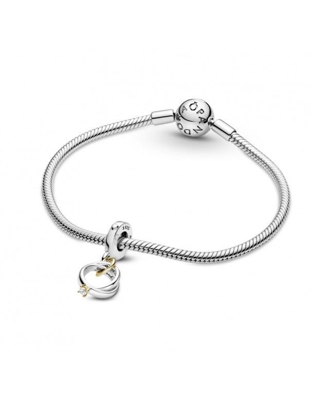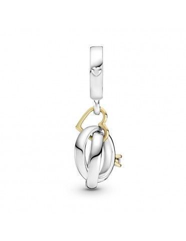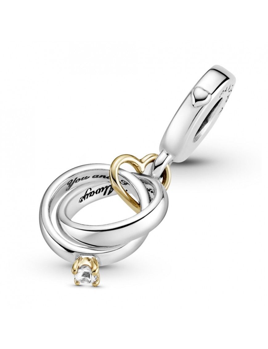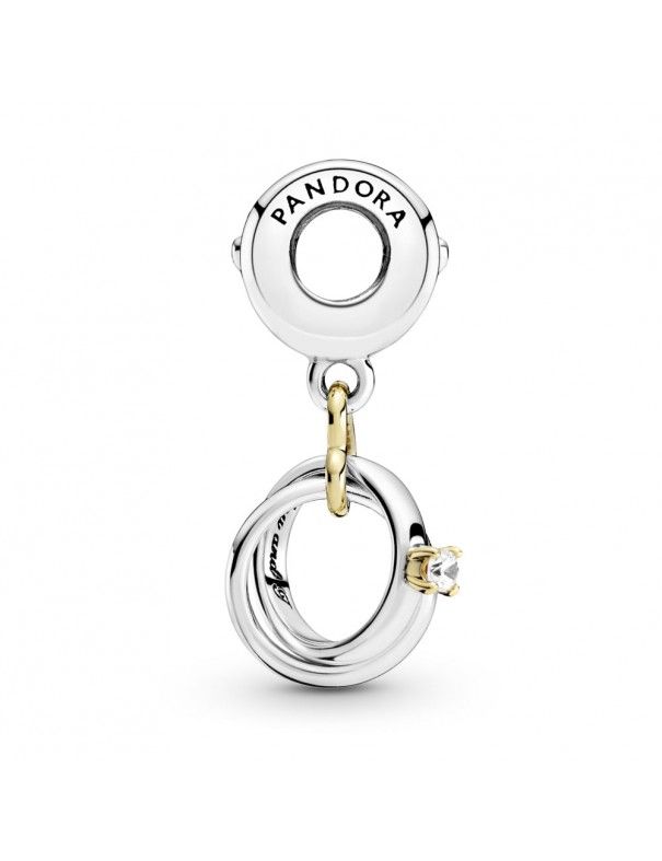 Charm Colgante Pandora Anillos De Boda 799319C01, en plata de primera ley y oro de segunda ley de 14k. Adornados con los grabados "You and I" y "Forever and always".