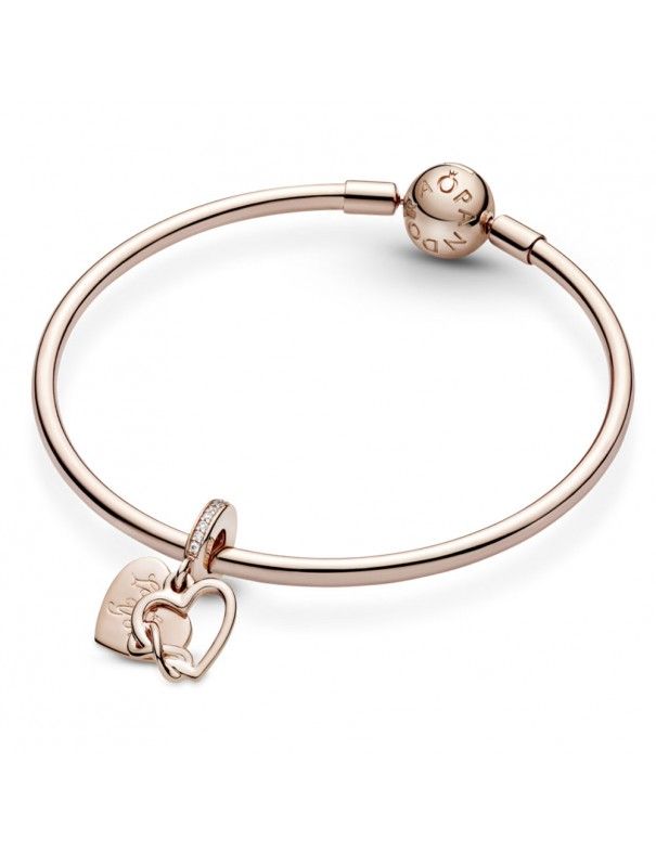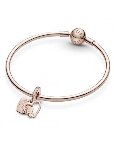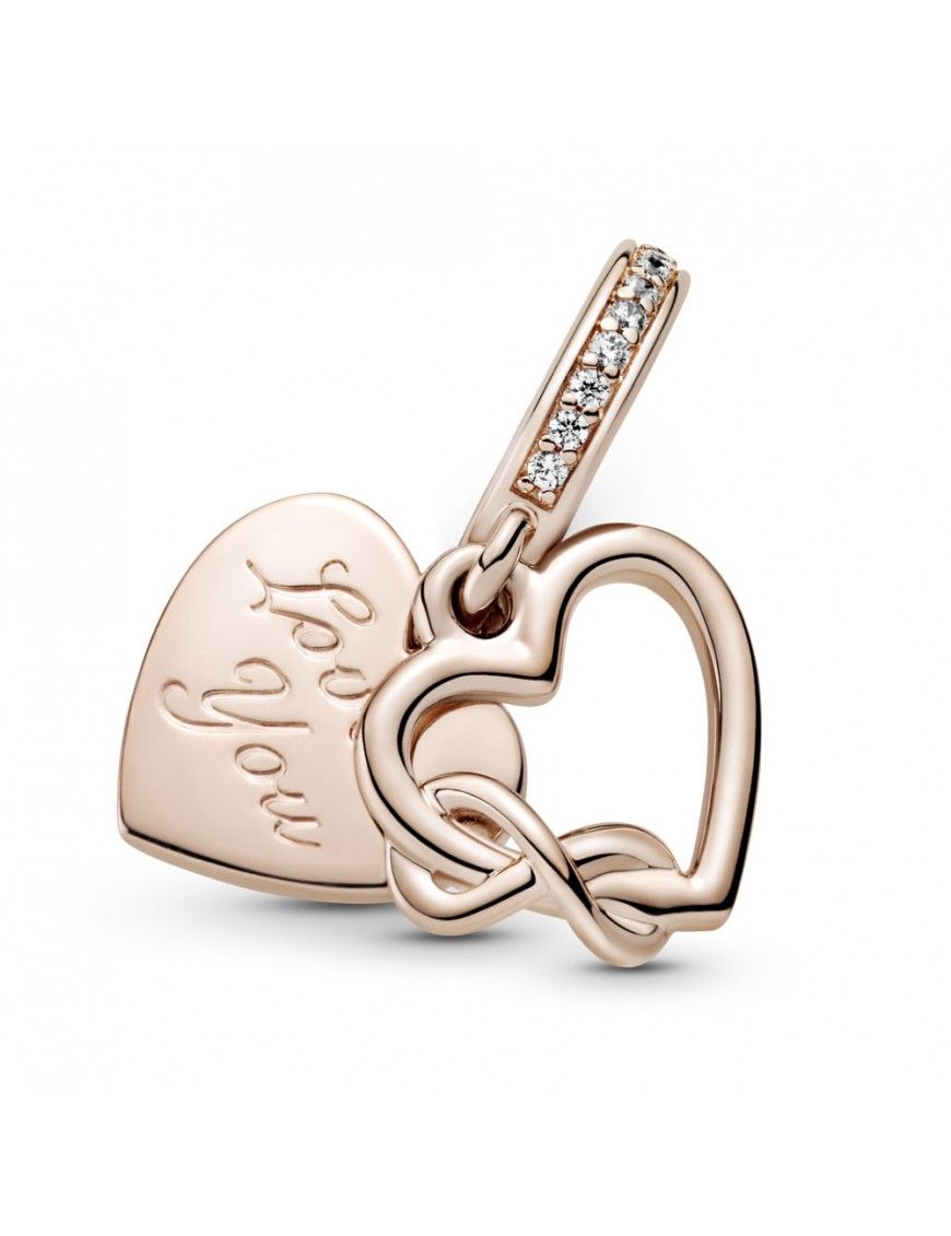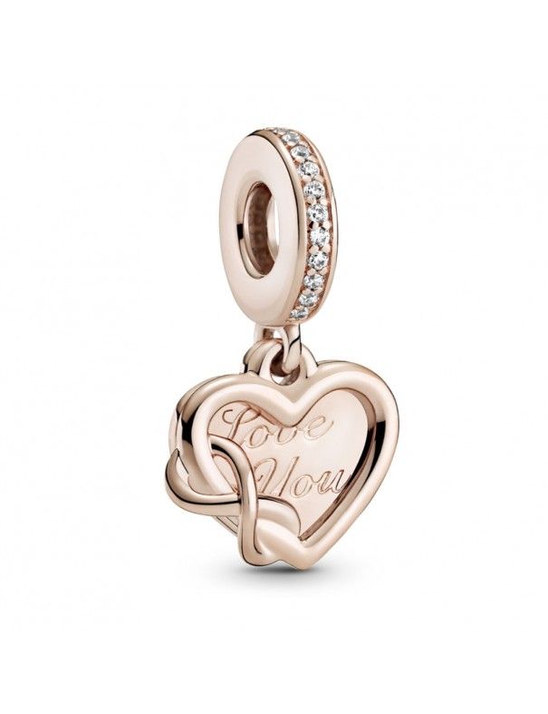 Charm Colgante Pandora Rose Infinito Love You 789369C01, una aleación de metales con recubrimiento en oro de segunda ley 14kts. Decorado con circonitas blancas. Corazón doble. Grabación "Always have, always will" "Love You".