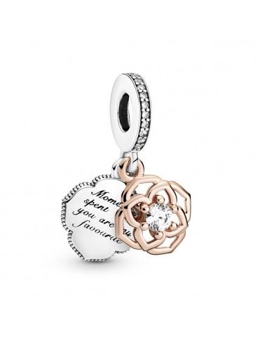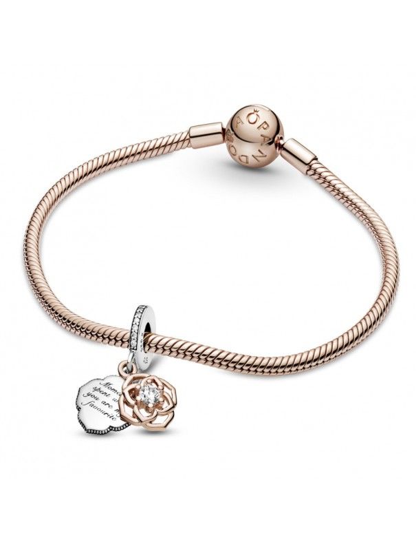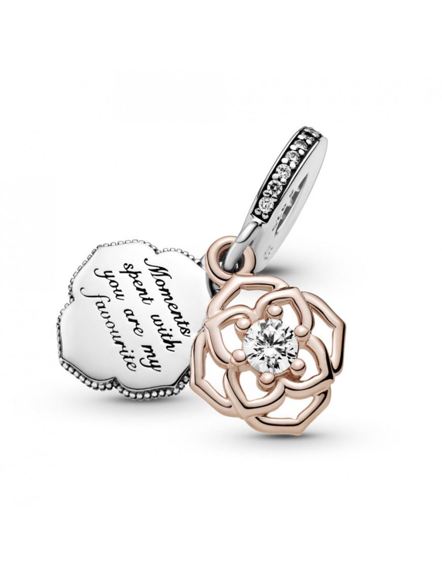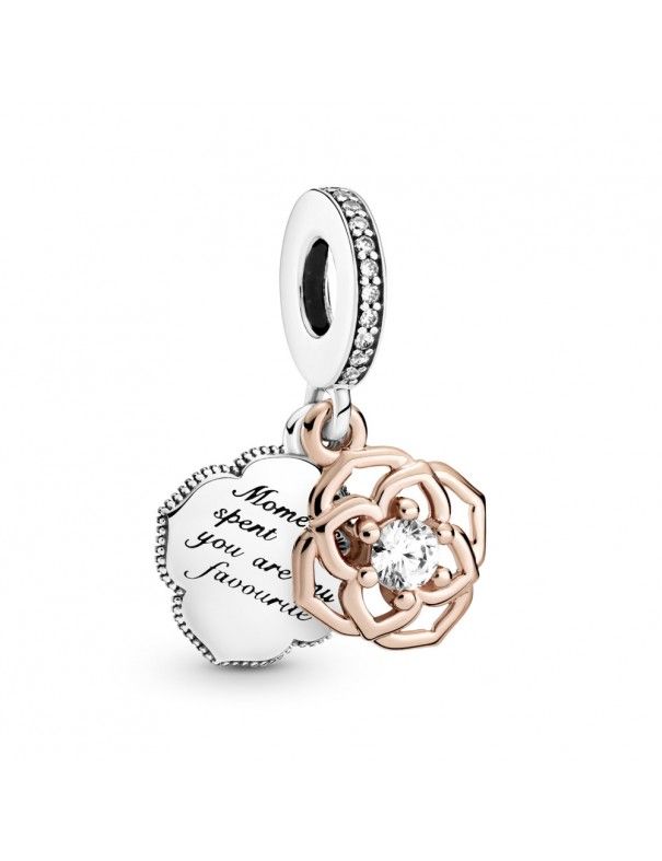 Charm Colgante Pandora Pétalos De Rosa 789373C01, en plata deprimera ley 925mls y Pandora Rose, una aleación de metales con recubrimiento en oro de 14kts. Decorado con circonitas transparentes y grabación "Moments spent with you are my favourite".