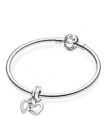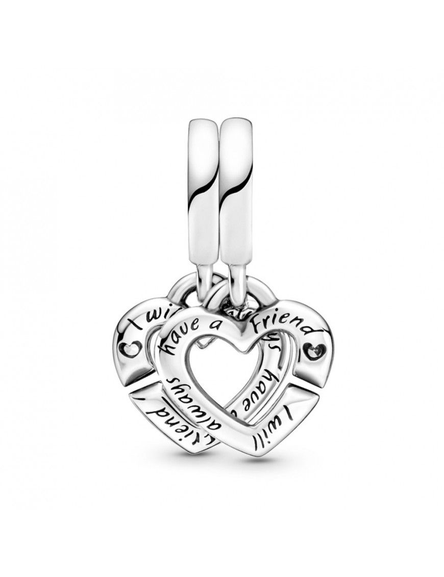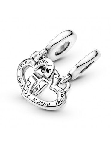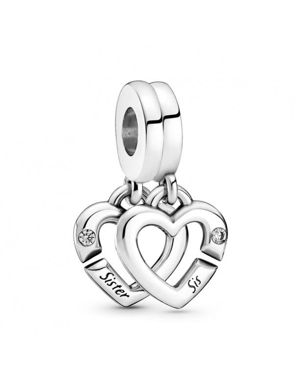 Charm Colgante Pandora Hermanas Unidas Corazones Divididos 799538C01, en plata de primera ley adornado adornado con circonitas cúbicas transparentes y grabado "Sister", "I will always have a friend".