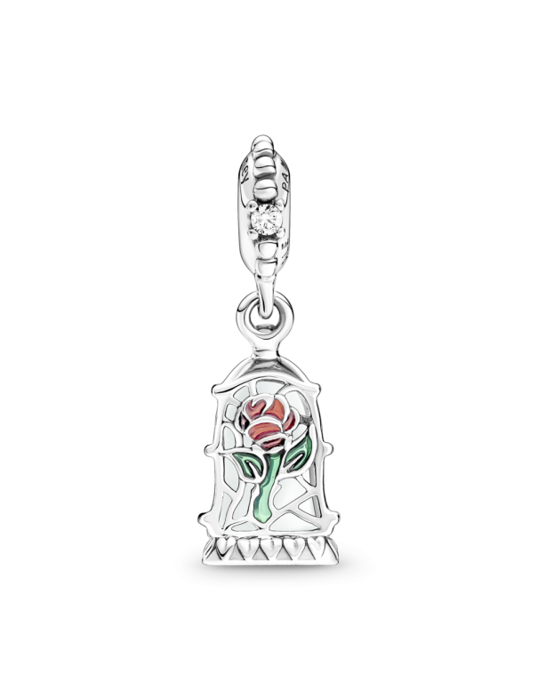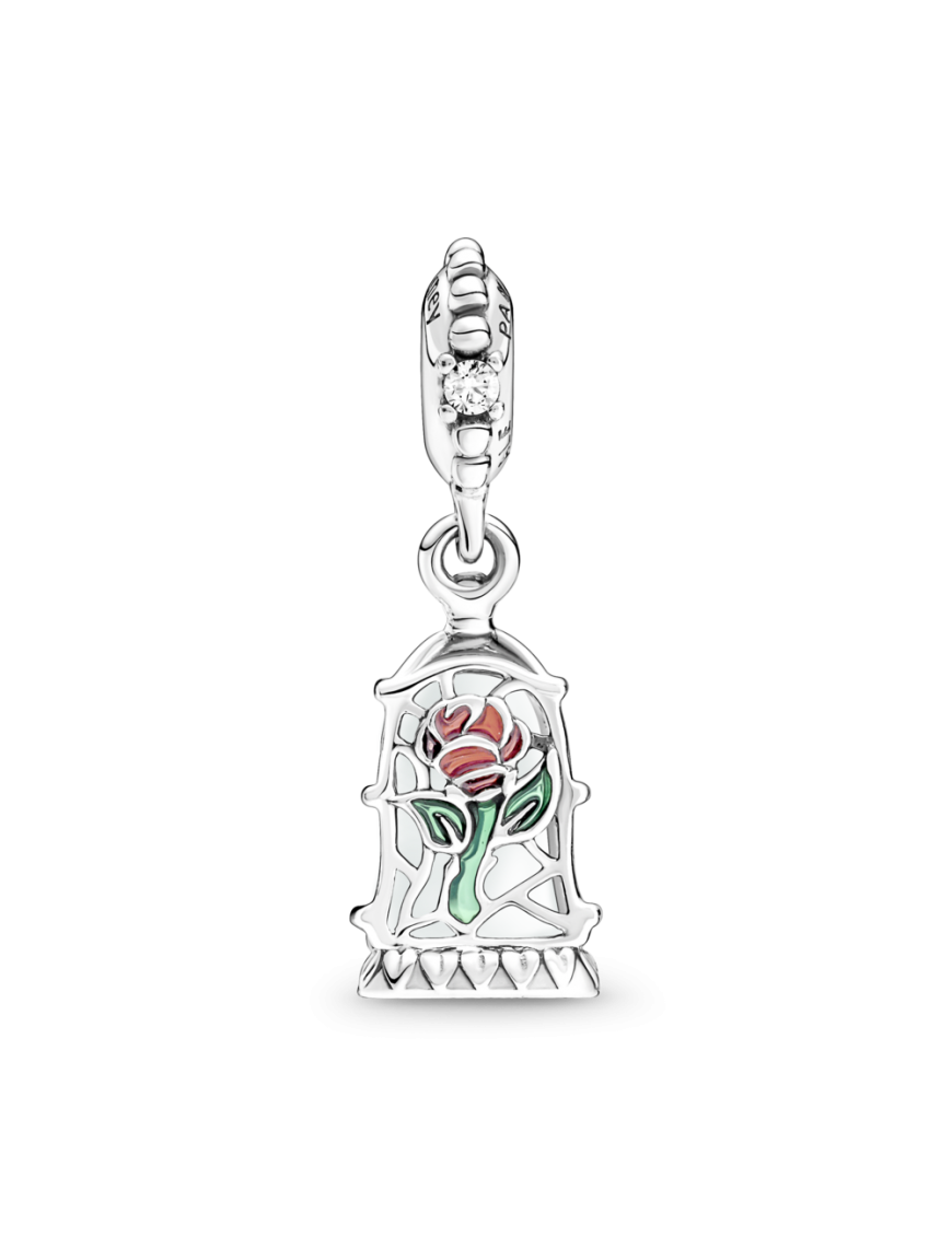 Charm Colgante Pandora Rosa Encantada 790024C01, en plata de primera ley 925mls, decorado con esmalte rojo y verde.