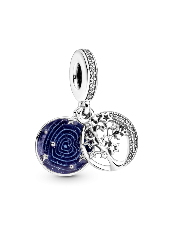 Charm Colgante Pandora Doble Árbol Y Luna de La Galaxia 799645C01, en plata de priemra ley 925mls, decorado con esmalte y circonitas. Grabación "Love you to the (moon) and back".