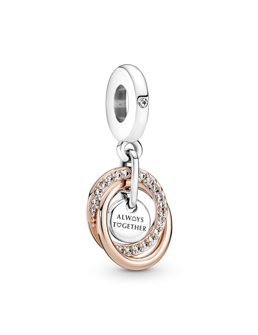 Charm Colgante Pandora Círculo Familiar Siempre 780797C01, en plata de primera ley 925mls y aleación de metales con recubrimiento electrolítico de oro de segunda ley de 14kts. decorado con circonitas blancas y grabación "Always Together".