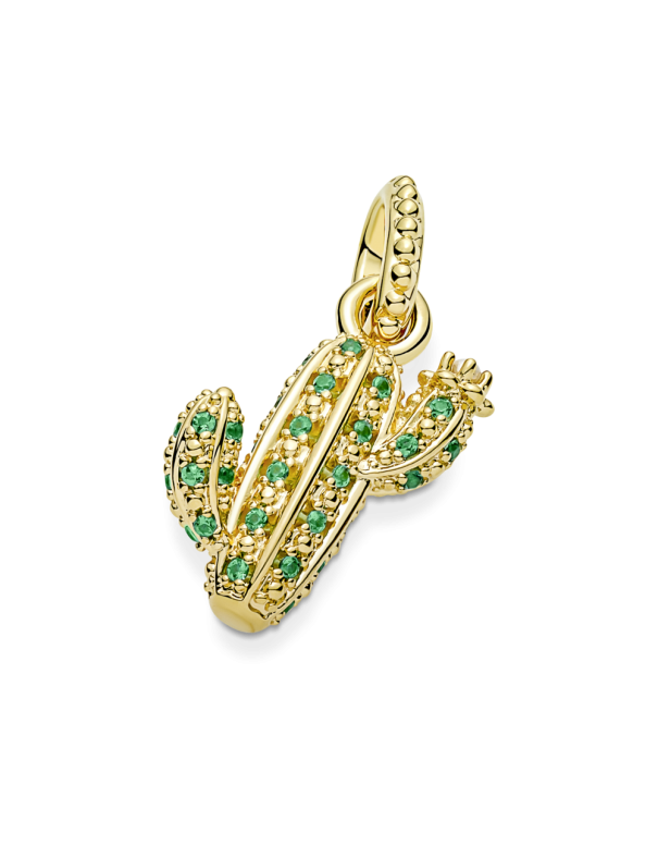 Charm Colgante Pandora Cactus del Desierto Brillante 361687C01, aleación de metales con recubrimiento electrolítico de oro de segunda ley de 14kts. Adornado con cristales verdes engastados de talla brillante.