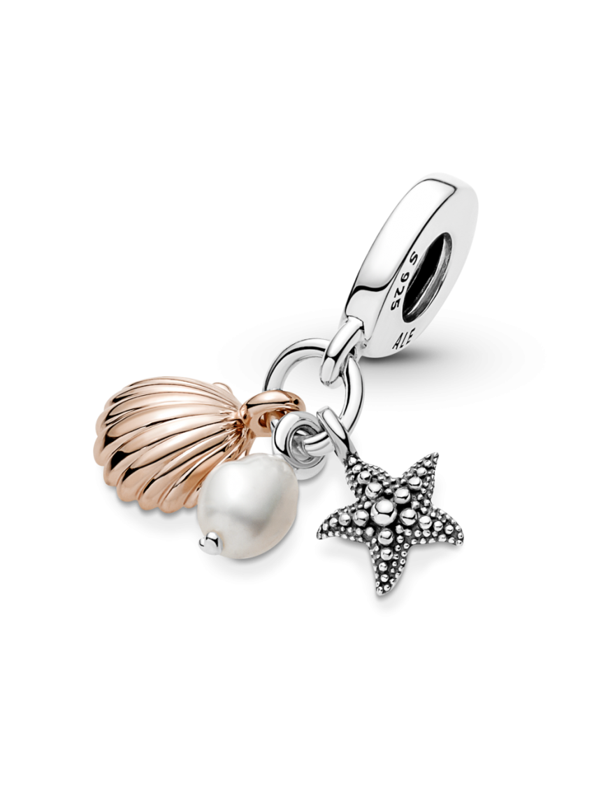 Charm Colgante Pandora Concha, Estrella de Mar y Perla Cultivada de Agua Dulce 781690C01, en plata de primera ley 925mls con un recubrimiento electrolítico en oro rosa de segunda ley de 14k con grabado “Y????u are my treasure”.