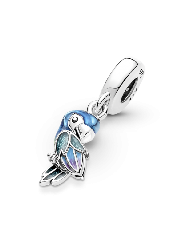 Charm Colgante Pandora Loro Jungla del Paraíso 791679C01, en plata de primer aley 925mls adornado con esmalte azul, lavanda, turquesa y amarillo.